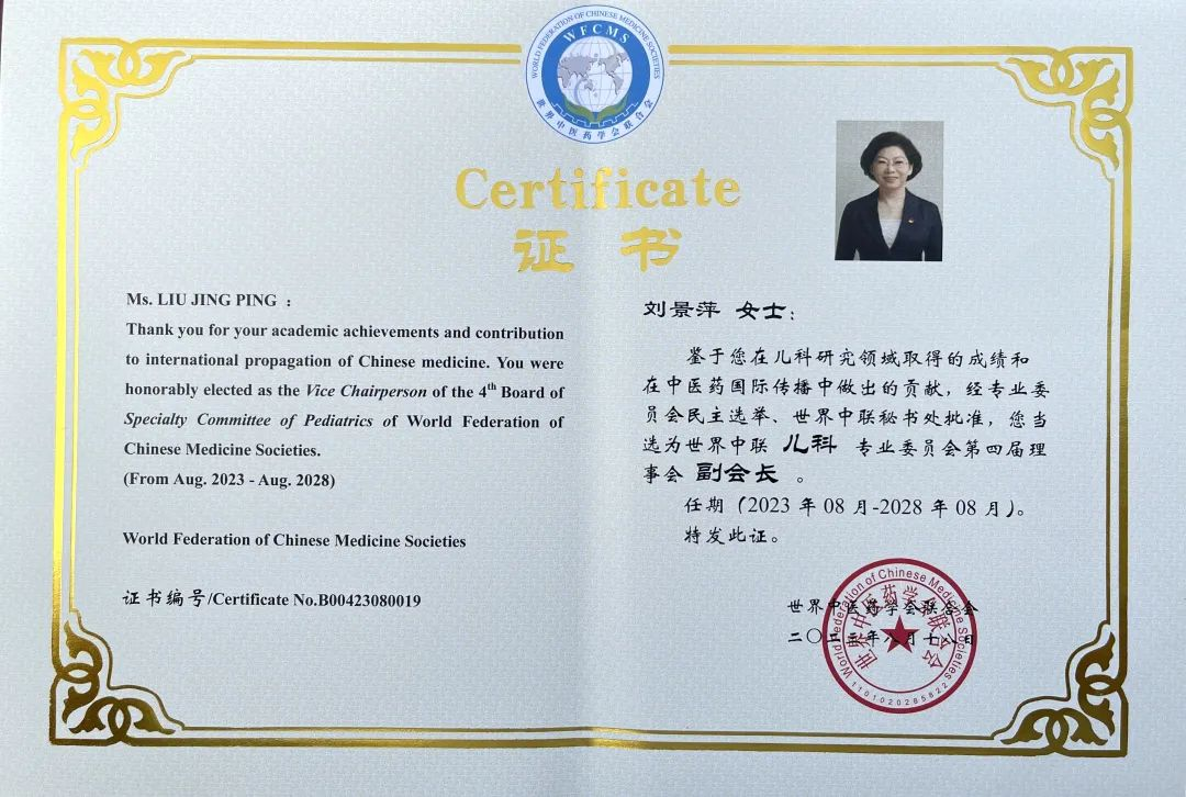豪门国际药业集团党委书记、董事长刘景萍当选世界中医药学会联合会儿科专业委员会第四届理事会副会长